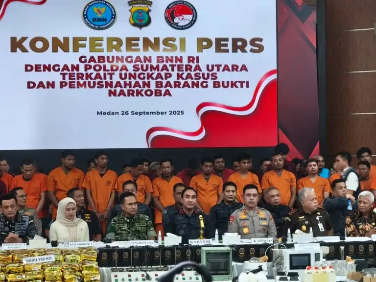 BNN RI bersama jajaran Polda Sumatera Utara pada Minggu (21/9/2025) berhasil mengungkap 1,4 ton narkotika yang terdiri dari sabu, ekstasi, kokain, dan ganja. Penangkapan ini merupakan hasil kerja keras sepanjang periode 1 Januari hingga 25 September 2025, dengan total 4.749 kasus di seluruh wilayah Polda Sumut serta 6.004 orang tersangka,” ujar Suyudi.
