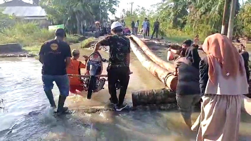 Batubara (Mitra Poldasu News) Jalan Provinsi yang menjadi penghubung vital antara Kabupaten Batubara dan Serdang Bedagai di Sumatera Utara putus total. Hal ini terjadi imbas banjir yang merendam wilayah Batubara selama sepekan terakhir. Ruas jalan yang terputus sedikitnya berada di lima titik, sehingga tidak dapat dilalui kendaraan warga. Sehingga solusi darurat, warga setempat berinisiatif membangun jembatan darurat dari batang pohon kelapa. Namun, jembatan ini hanya dapat dilalui oleh pejalan kaki. Sementara itu, sepeda motor yang ingin melintas harus digotong oleh warga dengan upah sebesar Rp20.000 untuk setiap sepeda motor.