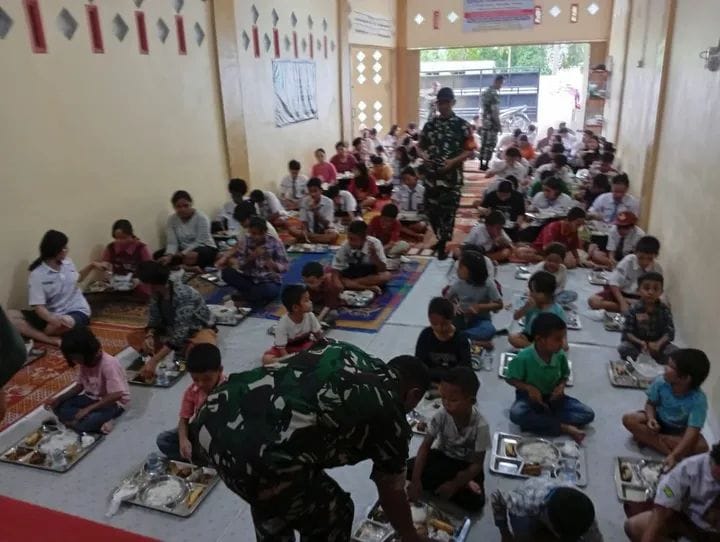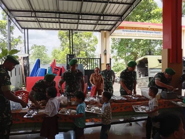 Suasana pembagian paket berlangsung penuh kehangatan. Anak-anak di panti asuhan tampak gembira dan antusias menerima makanan bergizi yang disiapkan langsung oleh prajurit TNI.