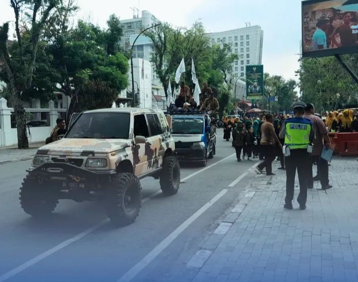 Medan (Mitra Poldasu News) Puluhan massa yang mengatasnamakan mahasiswa gelar unjuk rasa di gedung DPRD Medan tuntut pabrik kecap PT Kilang Kecap Angsa di Jalan Bono, Kecamatan Medan Timur, Senin (20/4/2026). Massa minta DPRD Medan rekomendasi penutupan pabrik karena limbah udara dan cair yang mencemari llingkungan.