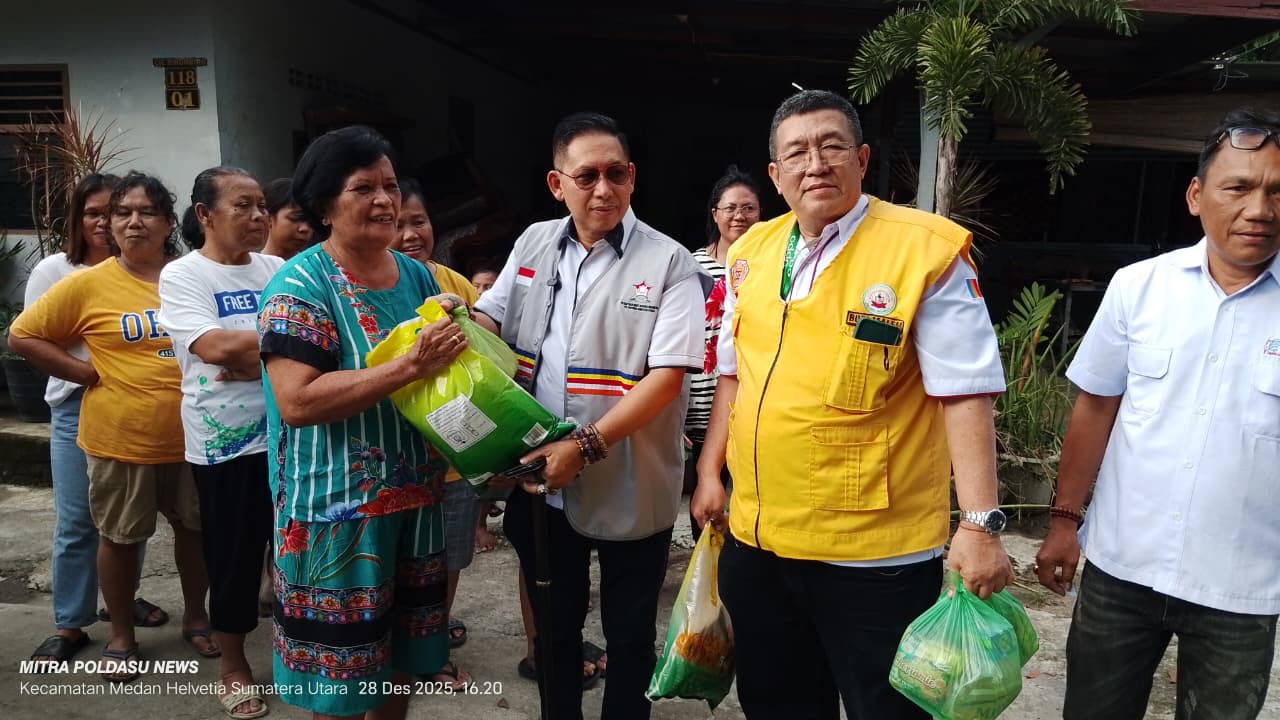 Medan (Mitra Poldasu News) Ketua Permabudhi Sumut (Drs Wong Chun Sen Tarigan M.Pd.B) bersama PTITD SI 76 Dan Martrisia Komda Sumut (Budi Malem SM.t) Menyalurkan 30 paket sembako dari pusat untuk masyarakat yang terdampak banjir di Jalan Pembagunan Gang Sejahtera Kecamatan Helvetia Kelurahan Helvetia Timur Minggu 28 Desember 2025 pukul 16.00 wib.